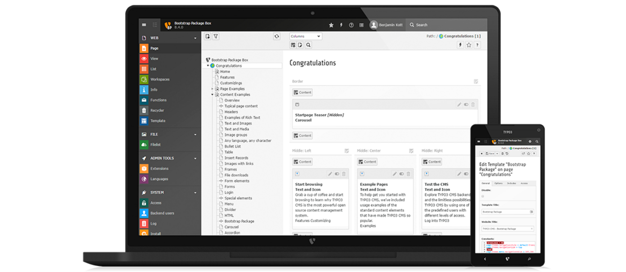 The administration interface, called TYPO3 Backend, can be managed from any modern web browser, including tablets and smart phones the same way. Publishing a small change on-the-go or working with tablet devices to add content has never been easier.